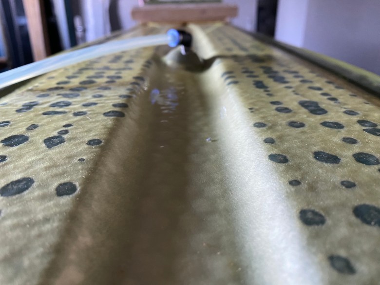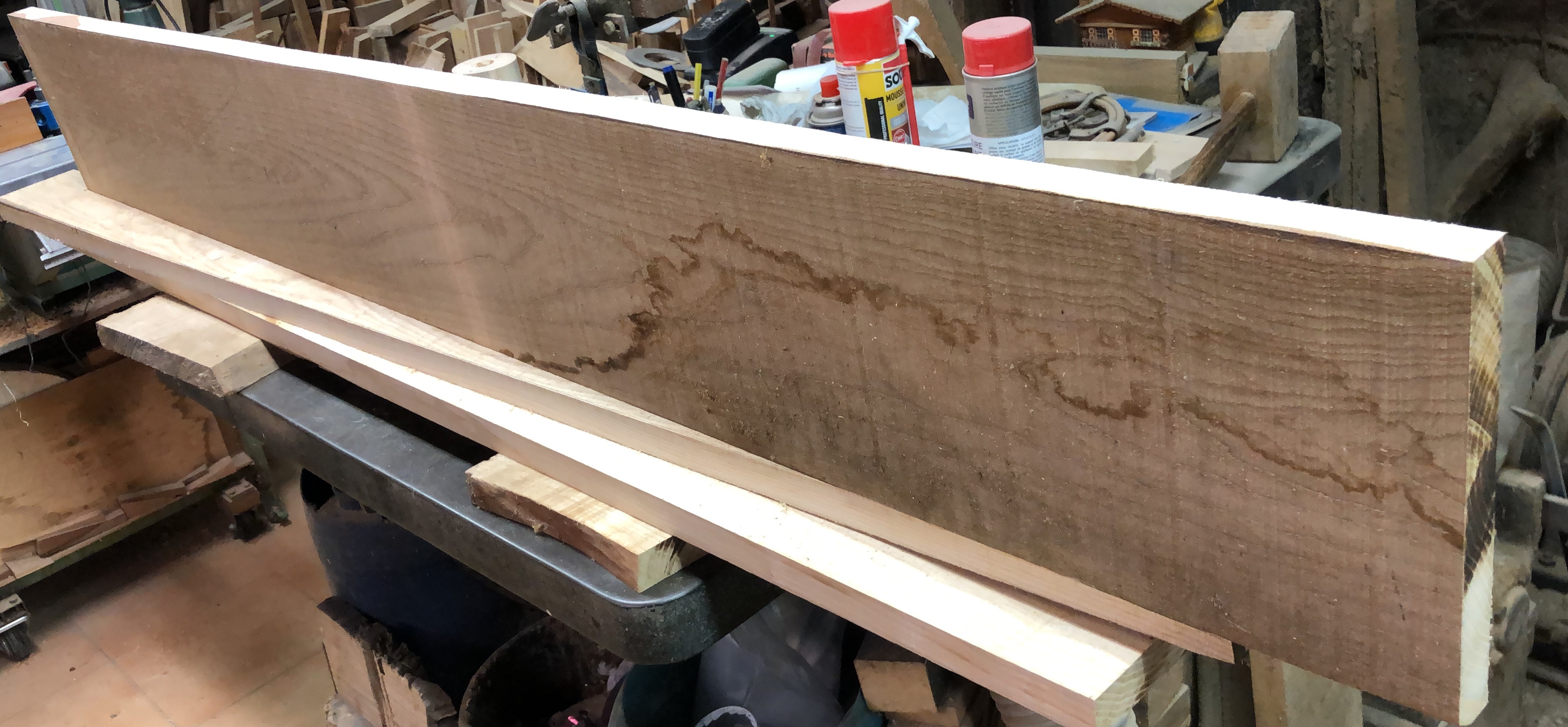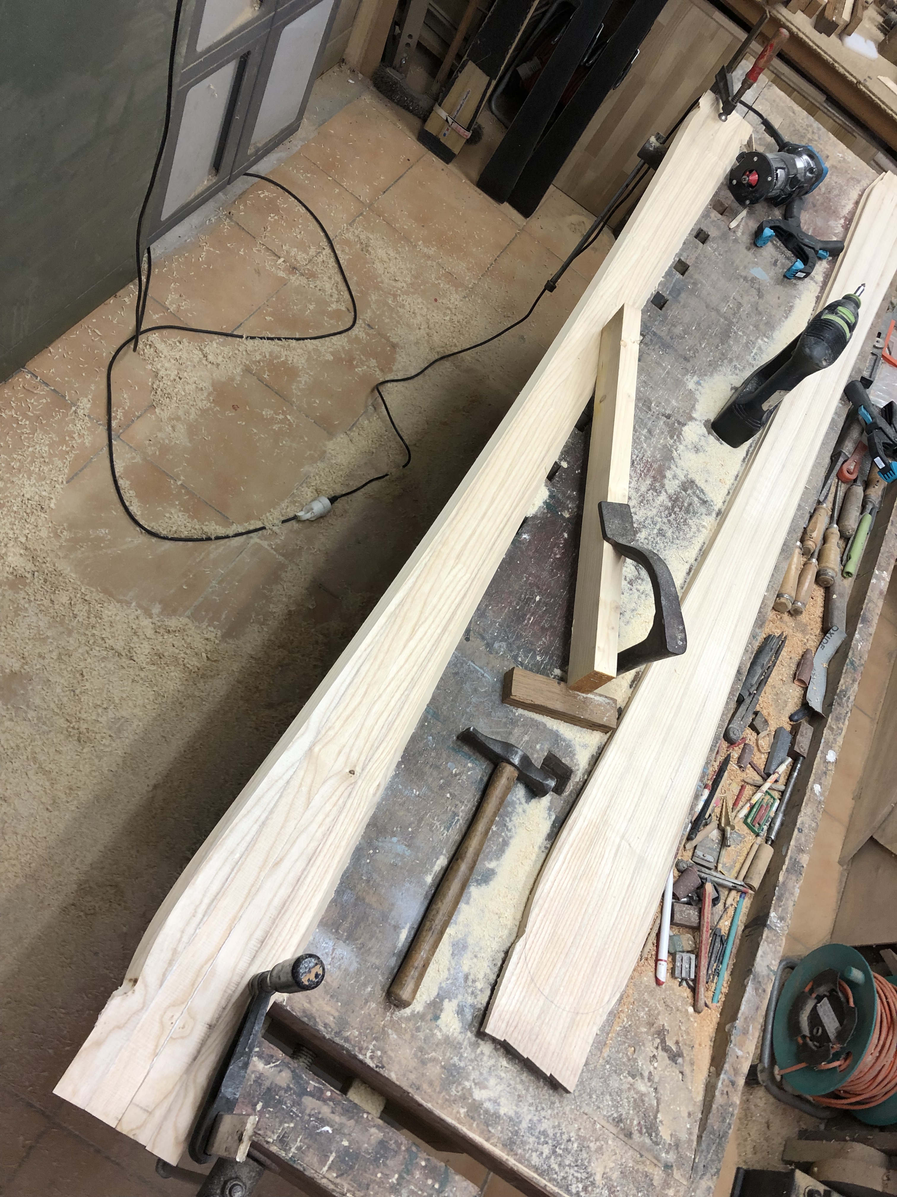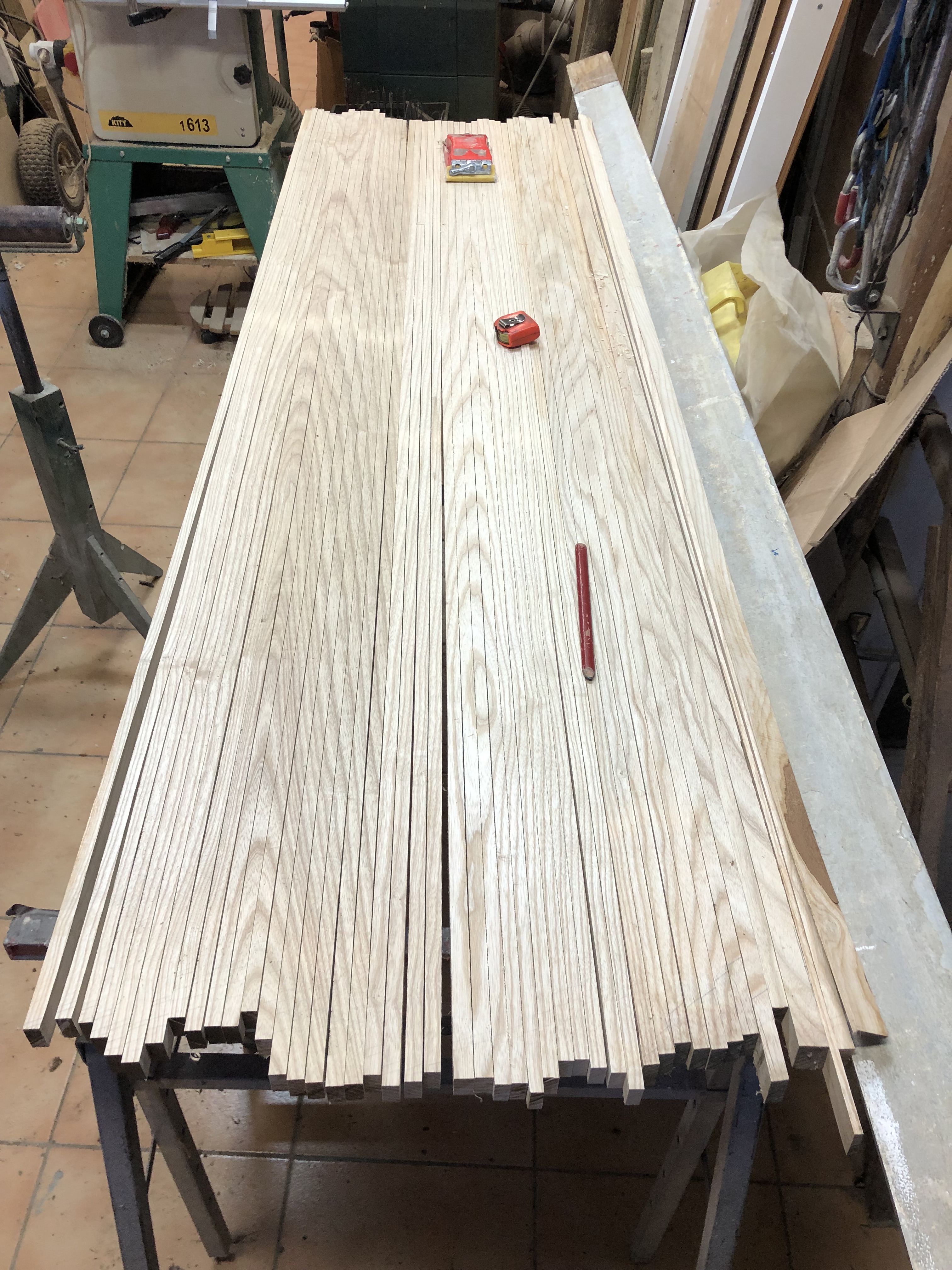 Plusieurs lattes sont coupées, puis inversées les unes par rapport aux autres pour neutraliser sa déviation naturelle du bois, puis collées à la colle PU.