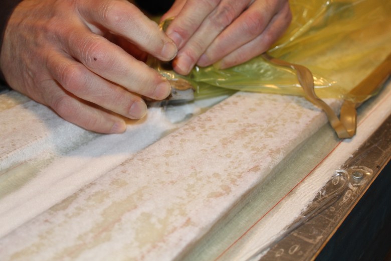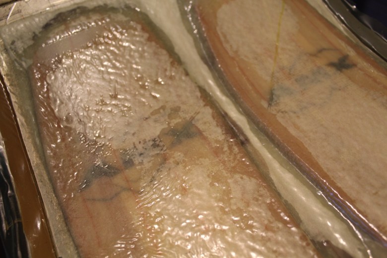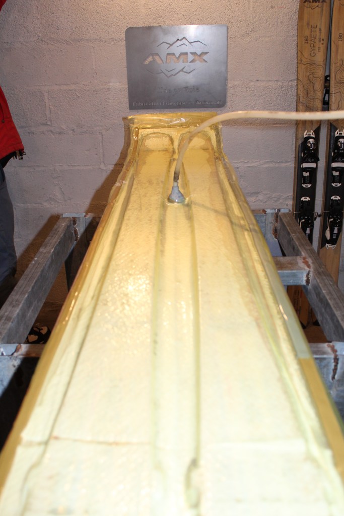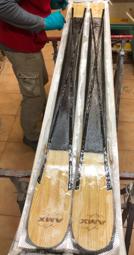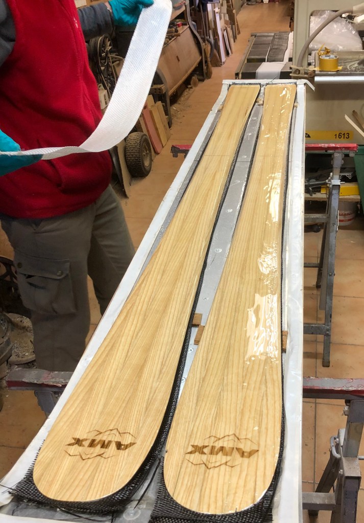 A la fin de la stratification, le sandwich est mis sous vide et la résine cuit à forte température contrôlée pour atteindre les caractéristiques mécaniques optimisées et stabiliser les skis.